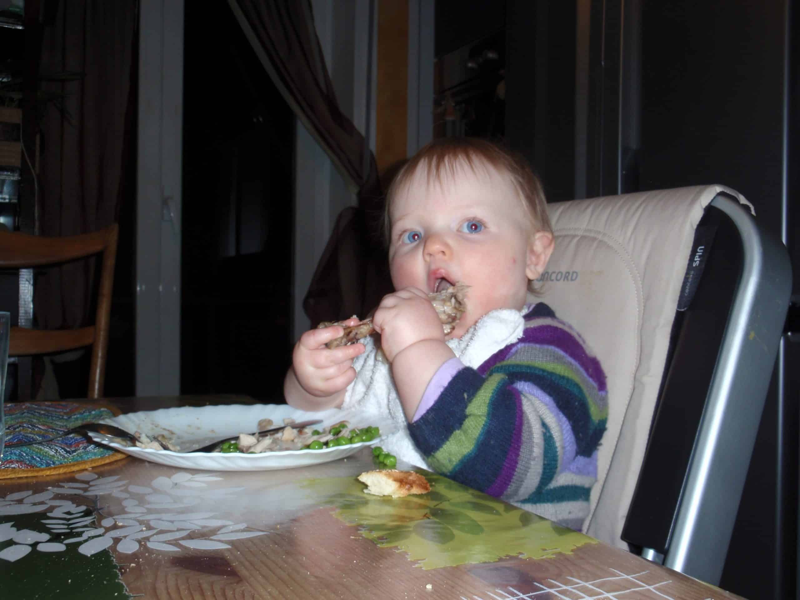 Bambina si svezza da solo con il pollo