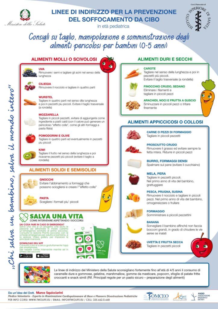 o frasi simili, dove si sottintende che se fai così non corri rischi, mentre se fai in altro modo è come giocare alla roulette russa. Questo è chiaramente assurdo. Innanzitutto va sottolineato che dietro questi “tagli sicuri” non c’è chissà quale ricerca, non sono linee guida, non sono concordate da chissà chi, ma semplicemente sono espressione del buon senso da parte di alcuni che hanno esaminato dei cibi e si sono chiesti, “come faccio a diminuire il rischio di soffocamento?” e hanno creato delle infografiche simili a quella che vedete mentre parlo, e che è stata pubblicata con l’alto patrocinio del ministero della salute. Ma non facciamo l’errore di considerare tutto ciò al pari di un teorema di matematica. Ad esempio, io non sono affatto d’accordo con alcune cose. Prendi ad esempio il kiwi… i kiwi maturi sono morbidissimi e davvero non presentano problemi. Invece quelli duri sembrano quasi delle mele, per cui non ha senso parlare di kiwi in termini assoluti. Prendete la carrellata di cibi “sicuri” che vedete come un qualcosa che serve a darvi un’idea, niente di più.